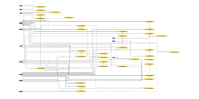 A zoomed-in view of a graph that showcases good edge routing and node and label layout.